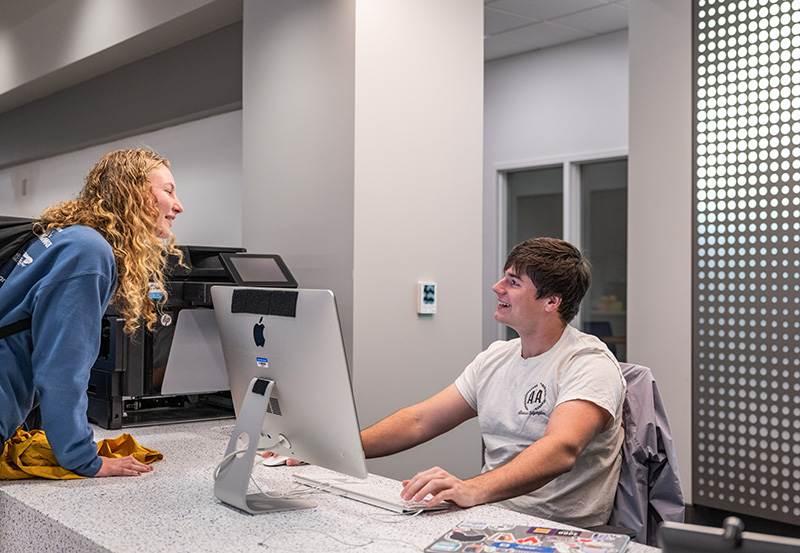 Jack Ertle ’26 assists a student at the new HUB Information Desk. Photo by Nick Chismar ’20
